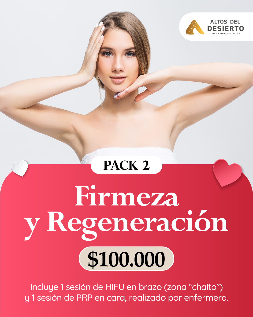 Incluye 1 sesión de HIFU en brazo (zona “chaito”) y 1 sesión de PRP en cara, realizado por enfermera.